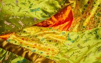 Veelkleurig satijnen doek met diverse afbeeldingen zoals libelles en bloemetjes in allerlei kleuren zoals oranje, geel,rood en blauw.