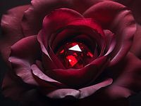 In deze weelderige roos, gevormd uit fluweelzachte bordeauxrode blaadjes, schittert een prachtig geslepen robijn als een gloeiend hart van licht. De subtiele curven van de bloembladen creëren een zachte beweging, terwijl de glanzende facetten van de…