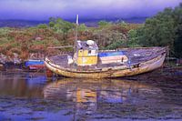 Een afgedankte boot ligt in de baai van Kyleakin in de Schotse Hooglanden.