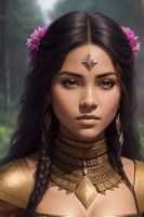 Ze is geinspireerd op Indianen en Azteken. Ze draagt verfijnde koper/goud kleurige kleding ,lange oorbellen en heeft paarse bloemen in haar lange zwarte haren. Op de achtergrond een dennenbos.