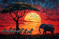 Het schilderij toont een adembenemende scène in de Afrikaanse savanne, waar zebra's en een majestueuze olifant in harmonie samenkomen. De lucht baadt in levendige kleuren als de zon langzaam ondergaat aan de horizon en gouden, oranje en paarse tinten over het landschap werpt.