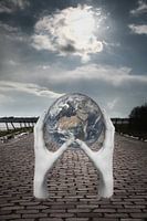 Surrealistische voorstelling van twee handen die de wereld vasthouden met wolk erboven