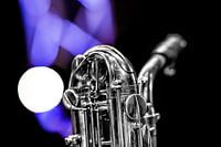 Zwart/wit saxofoon hals en mondstuk met led-licht op de achtergrond en een beperkte scherpte diepte. Blauw, wit,grijs en zwart zijn de enige tinten aanwezig in de afbeelding.