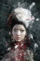 Abstract impressionistisch portret van een Japanse vrouw met bloemen in haar haar, in grove penseelstreken op canvas in groen,grijs en rood tinten.