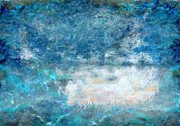 Een abstract landschapsschilderij in organische geometrische vormen, expressionistisch vervaagd maar met fijne texturen. Gevat in blauwe, warme grijze en beige kleuren met een impressie van Scandinavische kunst uit Noord-Europa.