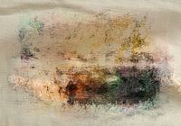 Een abstract schilderij van organische geometrische vormen vervaagd op textiel in goud, koper, warm grijs en beige kleuren met een aardse uitstraling van Scandinavische kunst uit Noord-Europa.