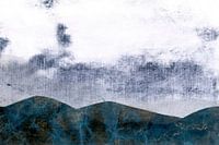 Een abstract schilderij van organische geometrische vormen met een licht expressionistische textuur in de kleuren wit, ivoor, grijs, warm blauwgrijs, indigo, grijs, koper, goud en beige met een impressie van Scandinavische kunst uit Noord-Europa.