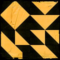 Een abstract schilderij in geometrische vormen op een eerder ontwikkelde collage in sterk geel en zwart met een impressie van Scandinavische kunst uit Noord-Europa.