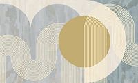 Een abstract schilderij van organische geometrische vormen in goud, grijs, crème, ivoor en beige kleuren met een vleugje Scandinavische kunst uit Noord-Europa. Geïnspireerd door de huidige Japanse stijl.