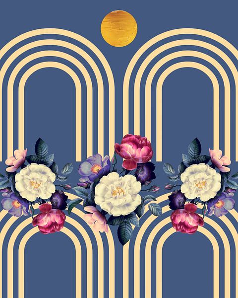 Voeg kunst toe aan je muren en maak er een echt thuis van met dit Scandinavische cottagecore kunstwerk met gouden maan en bloemen.