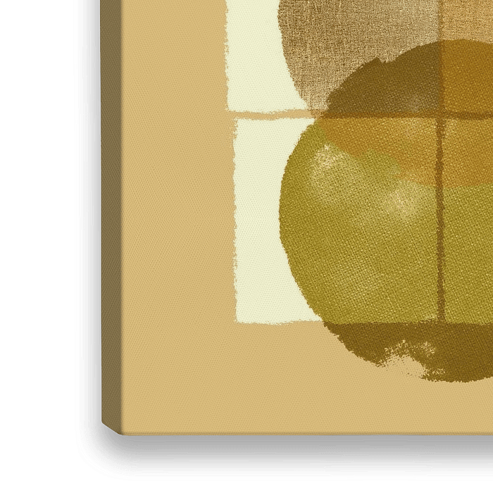 Een abstract schilderij van geometrische vormen in warme aardgele kleuren zoals bruin, beige, crème, goud, mosterd, kerrie, mango, goudsbloem en andere.
