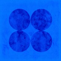 Een abstract schilderij van geometrische vormen in Scandinavische moderne kleuren zoals lichtblauw, donkerblauw, indigo en andere, typisch Scandinavische kleuren.