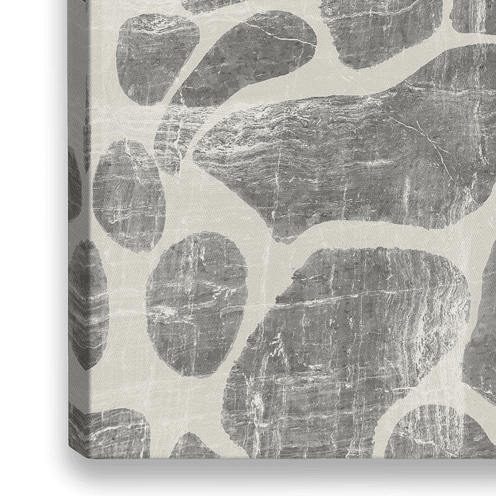 Een abstract schilderij van organische geometrische vormen in grijze en beige kleuren met een impressie van Scandinavische kunst uit Noord-Europa.