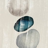 Een abstract schilderij van organische geometrische vormen in groenblauw, cyaan, grijs en beige kleuren met een impressie van Scandinavische kunst uit Noord-Europa.
