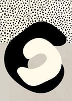 Een abstract, organisch geometrisch kunstwerk met stippen, vormen en bogen in de kleuren wit, grijs en zwart volledig neutraal.