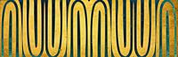 Een Scandinavisch abstract schilderij van geometrische vormen in het populaire XXL panoramaformaat in o.a. goud.