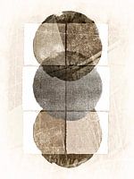 Een abstract schilderij van geometrische vormen in warme aardekleuren zoals bruin, beige, crème, goud, koper, oker, kaki, ivoor, middenbruin en andere.