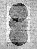 Een abstract schilderij van geometrische vormen in neutrale kleuren, zoals grijs, zwart en wit, op Japans papier.