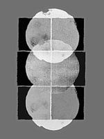 Een abstract schilderij van geometrische vormen in neutrale kleuren zoals zwart, wit, grijs en andere.