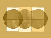 Een abstract schilderij van geometrische vormen in warme okergele mosterdkleuren.