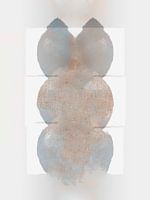 Een abstract schilderij in Scandinavische industriële geometrische vormen op onder meer grijze kleuren.