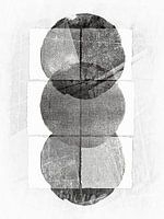 Een abstract schilderij van geometrische vormen in neutrale kleuren zoals grijs, zwart, wit en andere.