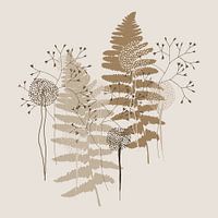 Moderne botanische illustratie met varenbladeren, gestileerde bloemen en grassen in neutraal gedempt retro kleurenpalet.