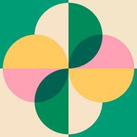 Een abstract schilderij van geometrische bogen en cirkelvormen in felle kleuren gecombineerd met neutrale elementen in beige en zandkleuren.
