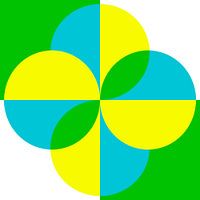 Een abstract schilderij van geometrische bogen en cirkelvormen in felle kleuren gecombineerd met neutrale elementen in beige en zandkleuren.
