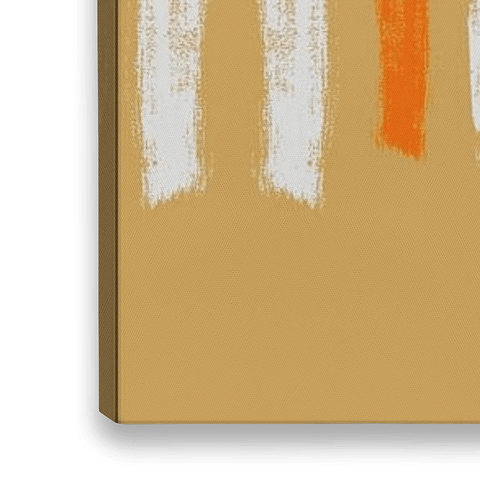 Een Scandinavisch abstract penseelschilderij van geometrische vormen in het populaire XL panoramaformaat in beige oker oranje en wit.