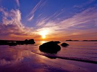 gaat 's nachts ten noorden van de poolcikel. Dit natuurverschijnsel is een hele bijzondere gebeurtenis om mee te maken. De lucht was deze avond heel spectaculair door de windveren en de reflectie van de wolken in het water van de zee en het natte zand op het strand tijdens eb.