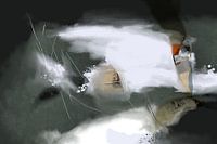 Een abstract scenario op een saliegroene achtergrond. Om de compositie te breken en als contrastmiddel zijn grotere wolkachtige witte vlakken ingevoegd. Weer een magisch werk van Roberto Moro.