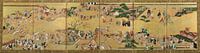 Een van een paar vouwschermen met zes panelen; inkt, kleur, goud en bladgoud op papier