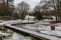 Scenic view over a wooden path through the Brussels wetlands, covered with snow