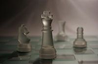 Glazen schaakbord spel opstelling. Close-up, koning en andere schaakstukken met achtergrond licht en schaduwen, reflecties. Sfeervolle verlichting.