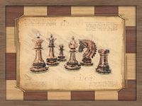 Schaakstukken. Vintage schetskunst. Achtergrond thema #1: Oud schaakbord.