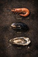 Deze keukenkunst-poster toont schaal- en schelpdieren uit de Noordzee in een sobere, verstilde compositie. Garnaal, mossel en oester worden niet gepresenteerd als gerecht, maar als grondstof: rauw, tastbaar en eigenzinnig van vorm.
