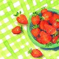 Verse sappige rode aardbeien in een groene schaal op een tafel wachten om gegeten te worden als een zoet dessert in dit aquarel schilderij in hedendaags vierkant formaat. Terwijl ik droomde van het oogsten van deze heerlijke vruchten in mijn zomertuin, speelde ik met contrasterende kleuren rood en groen en contrasterende geometrische vormen zoals ronde vruchten en schalen en rechte lijnen voor het tafelkleed op de achtergrond. Bon appetit! 358