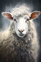 Schaap | Crèmewit - Op dit digitaal gecreëerde kunstwerk zien we een schaap frontaal afgebeeld, met een focus op de tedere expressie en de rijke textuur van zijn wollige vacht. De stijl is realistisch met een vleugje zachte luminantie, waarbij de grijze achtergrond subtiel contrasteert met de crèmewitte en bruine tinten van het dier, wat zorgt voor een rustgevende uitstraling.