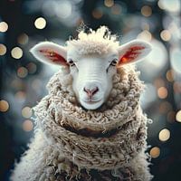 Een portret van een schaap gehuld in een heerlijk warme wollen sjaal. Op de vage achtergrond twinkelen lichtjes.