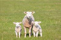 Ooischaap, Ovis orientalis aries, ooi met lammeren, Sleeswijk-Holstein, Duitsland