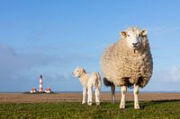 Damesschaap, Ovis orientalis aries, ooi met lam, Sleeswijk-Holstein, Duitsland
