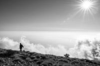 Zwart wit foto van een Schaapherder in de bergen. Hij loopt boven de wolken. Achter de wolken is de zee zichtbaar. Laagstaande felle zon. De foto is gemaakt in Albanië.