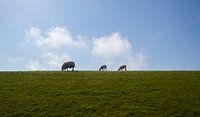 3 schaapjes op Ameland gemaakt op een dijk, 2 hiervan zijn lammetjes. De schapen steken prachtig af tegen de blauwe lucht met wolkjes. Het is een heerlijk typisch Nederlands beeld.
