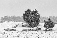 Het sneeuwt en een kudde schapen zoekt beschutting onder de jeneverbes struiken op het Drouwenerzand. Ik doe dus maar hetzelfde en trek snel plastic over de camera.