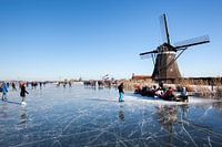 Nederlands winterlandschap in 2021, met schaatsers op de Rottemeren bij molen molenviergang in Zevenhuizen