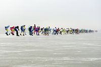 Schaatspeloton op de mistige Oostvaardersplassen tijdens het NK marathonschaatsen op natuurijs op 8 januari 2009. De wedstrijd werd gewonnen door Sjoerd Huisman.