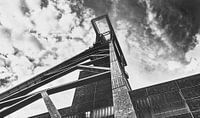 Een stalen monster stijgt op naar de hemel. De indrukwekkende kronkelende toren van de Zollverein-mijn, in de zomer gefotografeerd onder een bewolkte hemel vanuit een kikkerperspectief.