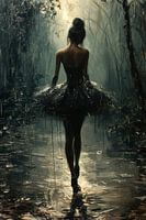 Dit trendy, intieme kunstwerk portretteert een ballerina van achteren, staand op één been, met haar andere been licht gebogen en haar armen boven haar hoofd in een elegante pose. De danseres is gekleed in een donkere tutu die lijkt te versmelten met de donkere, bijna sombere omgeving waarin ze staat. De achtergrond is uitgevoerd in koele, donkere tinten met hints van licht dat door de schaduwen heen breekt, wat een gevoel van diepte en mysterie geeft.