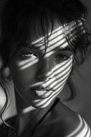 Dit fascinerende portret van een vrouw speelt meesterlijk met licht en schaduw. De scherpe lijnen van het strooklicht geven het beeld een dramatische en mysterieuze sfeer, terwijl de intense ogen en sensuele lippen van de vrouw de kijker betoveren. Een perfect kunstwerk voor liefhebbers van uitzonderlijke fotografie die de magie van…